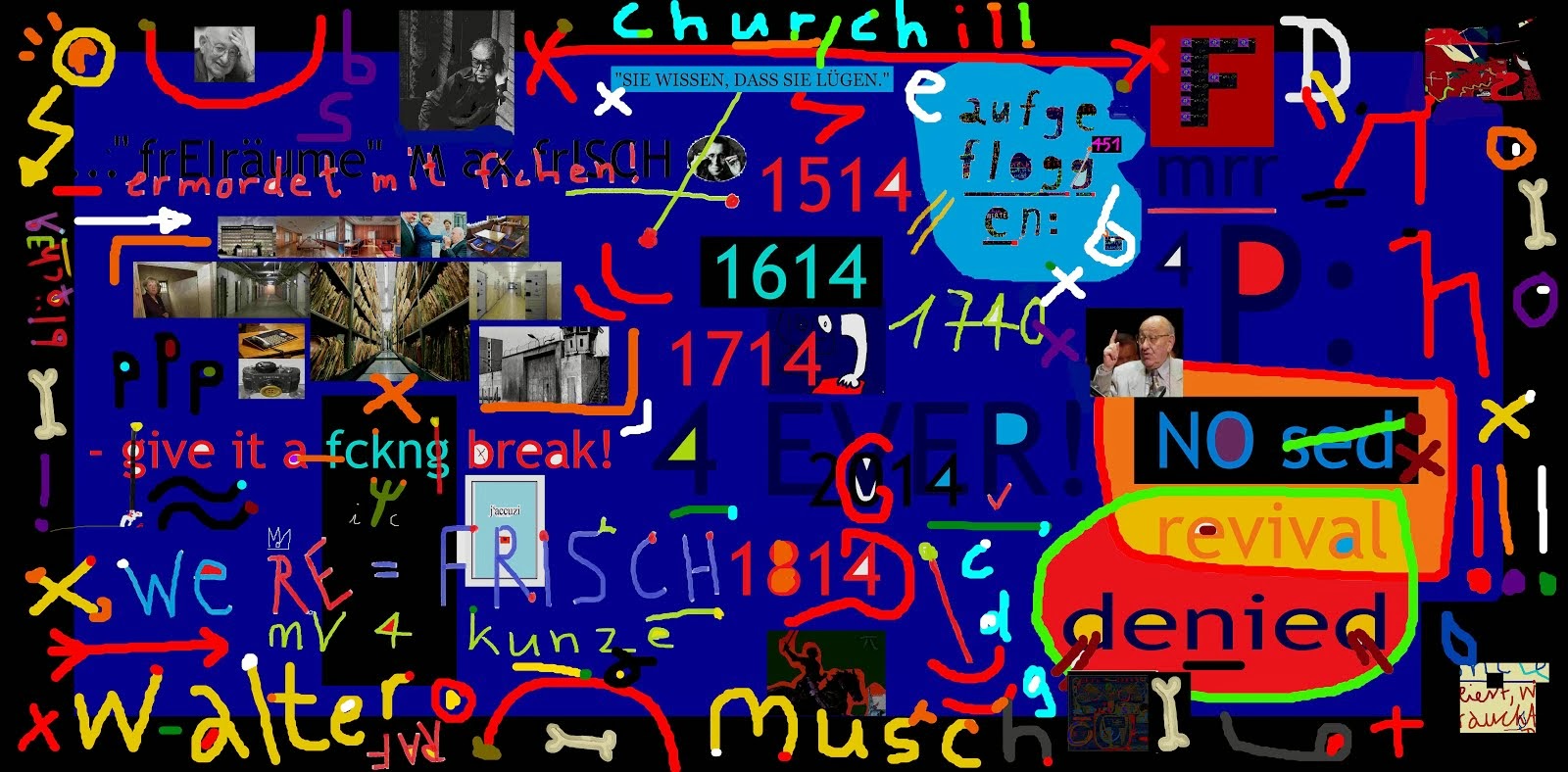 darum wäre aussprache, meinetwegen auch öffentlich mit gebüchnertem, nobliertem, meine vorwürfe i.m. jünger, frisch nicht UNbedingt von der hand zu weisen ... will man sich damit nicht zufrieden geben, dass einer historisch vorsorglich zur strecke gebracht wurde mit deutschen attributen wie RASSENSCHANDE, RAUBKUNST b-legt, ch tante für bereicherungszwecke wiederum als kollabsoration b-leidigt als nazikohlabröse (und maria becker als ZUgabe - RÜCKTRITT MAUch! dieses faschistische wort gegen brecht/FD verdiente jahrhundert schauspielerin per exCHrüsi geht historisch NICHT durch ... wie die mauCHelei gegen mich klar auch nicht; s. blog "13 alles paletti") , arvhive auflösen bei dnb l is auch nicht mein verständnis von zensURfreiheit, vor allem von einer alkademikerin für unBkannt stammend ... staatstrojaner, deaktivierungs- und/oder diskreditierungslinks, usw. SÄ LONG LISchT (after only 2 yrs) - wo ist SOLIDARITÄT, ausser öffentlich vorgetragener für das wort, den begriff? - die zeitungen könnten doch JETZT genau jetzt auffordern, jeder soll das lang ersehnte buch von suhrkamp jetzt genau jetzt kaufen (und ich bin nur fastautor; so ETWAS KÖNNTE, MÜSSTE von dg & co kommen, MENSCH!) - NEIN, lieber monate lang über insolvenz vertrödeln, wa?! DER VERLAG IST wichtig, no? - USE CREATIVITY, i.m. ERIKA: hei nomal, würkli wie im chindergarte, da wie döt, zwenig fanta SIE er es ... - weiterchillen