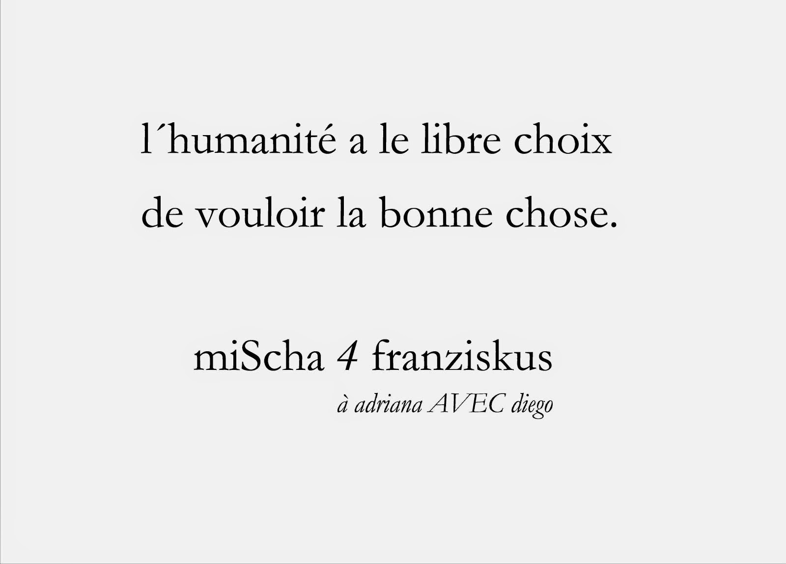 a boy´s dream, i know, i.m. henri DUNANT and albert schweitzer : that for the first time in human history, on one single day every human being has fresh water to drink and enough bred/rice/noudles to eat - just to prove that we are so fckng brilliant, YES we can, etc., that it is possible, one day only, then the second day, third, always - FOOD 4 everybody, 4 free, in the name of SOLIDARITY. mischa vetere, 11th of november 2012 (1789 -e)
